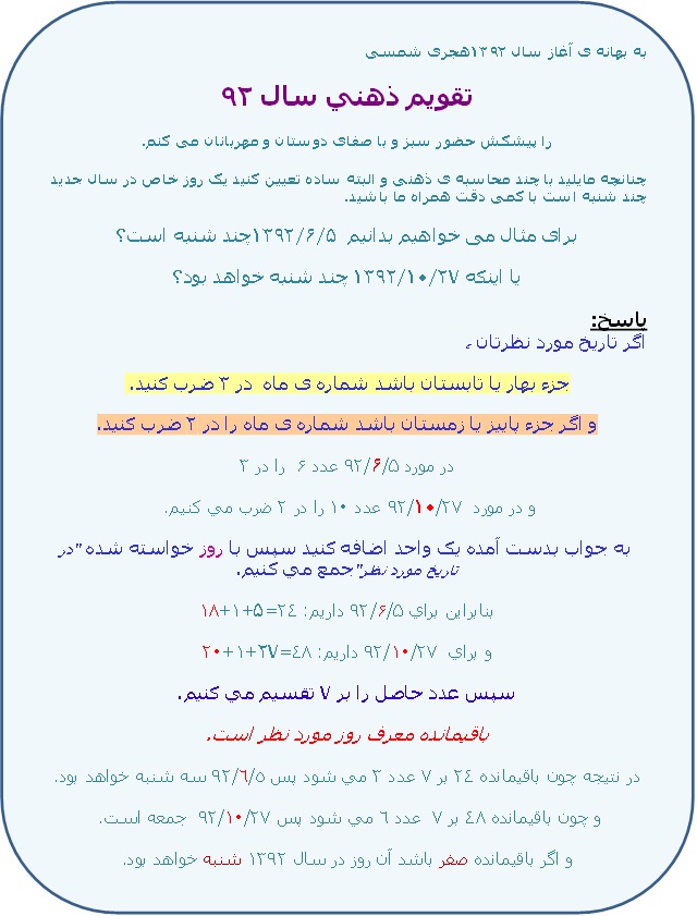 بنابراين اگر مايليد با يك محاسبه بسيار ساده وذهني تعيين كنيدكه يك تاريخ مورد نظر سال 1388 چند شنبه است مطالعه اين قسمت را از دست ندهيد.