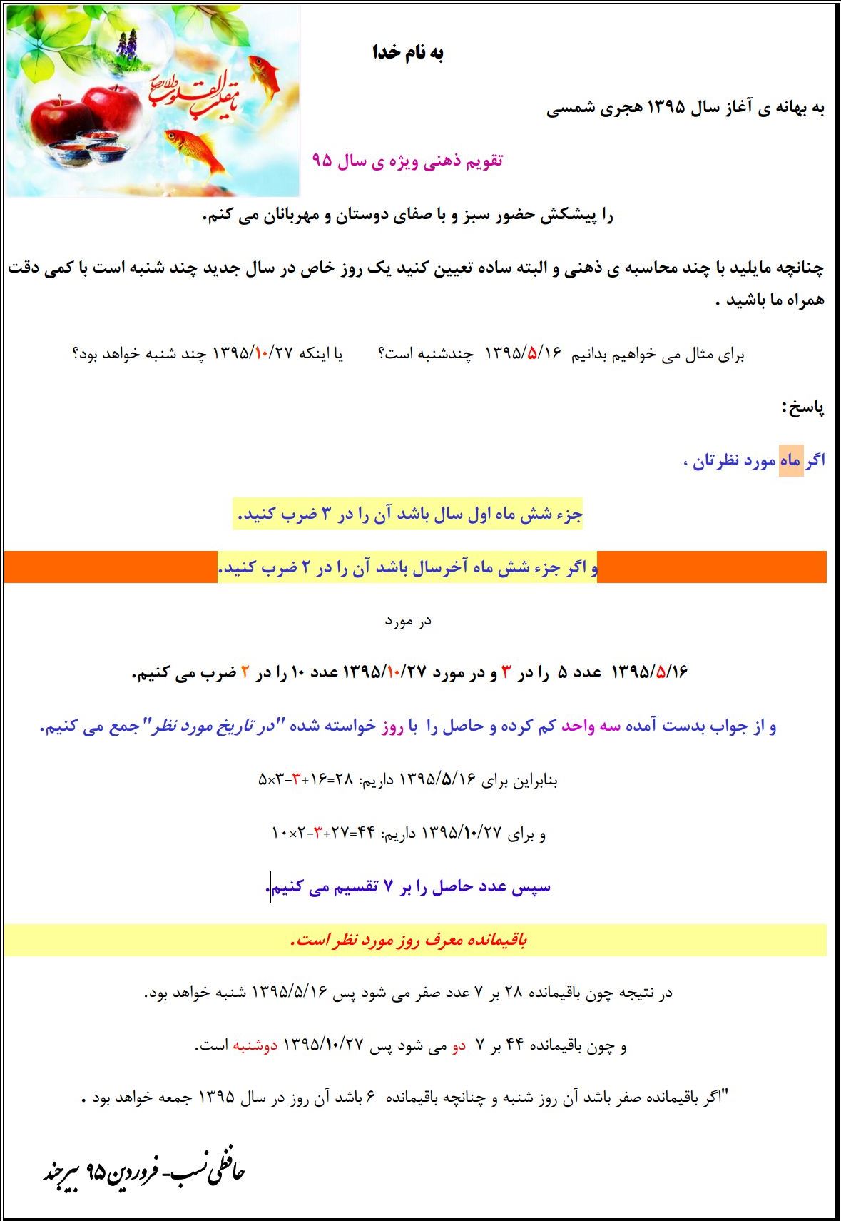 در چند سال قبل يكي از بستگانمان كه از سربازي برگشته بود ، تقويمي را برداشت و يك ليست از عددها را يادداشت كرد و از حاضرين تقاضا كرد كه بپرسند: يك تاريخ مورد نظر در آن سال چند شنبه است؟